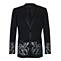 Black 2 button single breasted dress jacket with black satin trim and silver baroque style applique silver; single vented and fully lined; 50% wool, 50% polyester. Jacket can be worn on its own or matched with Black trousers with black Swarovski buttons; White cotton dress shirt with emerald cut crystal buttons. Complete the look with a Black satin bow tie or Black satin long necktie.